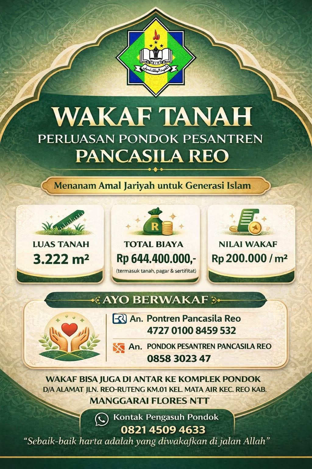 Humas - Pondok Pesantren Pancasila Reo membuka program wakaf tanah sebagai upaya mendukung perluasan kawasan pesantren dan pengembangan fasilitas pendidikan bagi para santri. Program ini mengajak masyarakat untuk turut berpartisipasi menanamkan amal jariyah demi keberlangsungan pendidikan generasi Islam di masa depan.